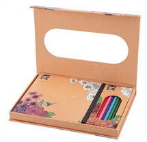 Denne fine gaveæske indeholder en malebog fyldt med smukke blomster og naturmotiver samt 10 farverige træfarveblyanter, så dit barn kan komme i gang med det samme 🌼🖍️