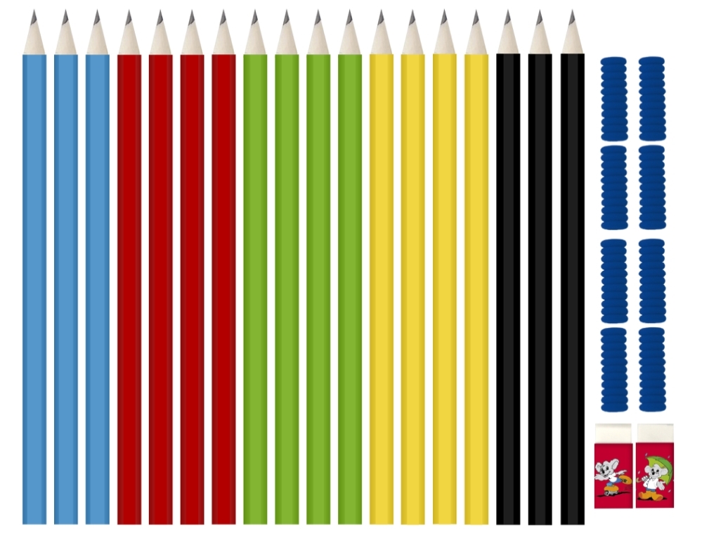 Sættet indeholder 18 blyanter, 8 ergonomiske blyantgreb og 2 viskelædere – perfekt til både børn og voksne, der elsker at skrive, tegne eller skitsere.