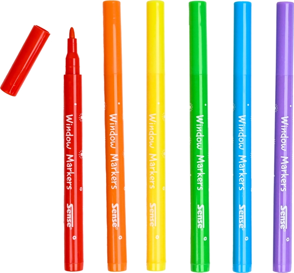 SENSE vinduesstusser – 6 farverige tuscher til kreative børn. Tegn direkte på vinduer og glas, og vask nemt af igen. Sikkert, sjovt og EU-godkendt legetøj. 🎨💛