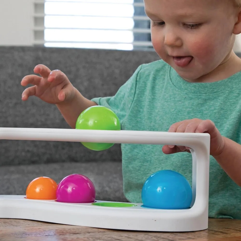 De farverige kugler ruller ned ad banen og lander i deres matchende pladser – alt imens finmotorik, hånd-øje-koordination og farveforståelse styrkes.