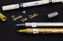 Sæt med 3 metalliske tuscher i guld, sølv og hvid. Dobbelt spids og perfekte til brug på sort papir. Giver et flot og glansfuldt resultat. ✨🖊️