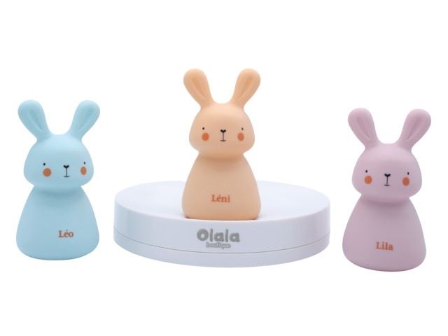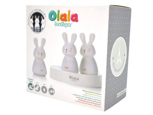 Olala Boutique Trio er en natlampe, bestående af 3 farvede kaniner, som hver især lyser - Leo, Leni og Lila.