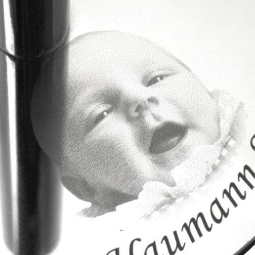 Flaget bliver graveret med foto af barnet, barnets navn, fødselsdato, fødselstidspunkt, længde og vægt samt navngivningsdatoen.