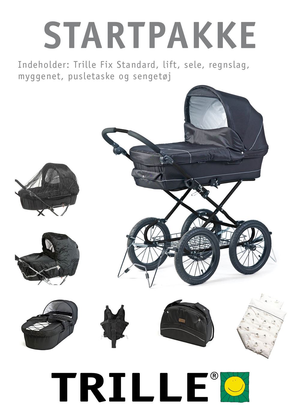 • Trille Fix barnevogn med lift, tynd madras, varekurv, lufthjul, justerbart styr, dobbelt bremser, vaskbart stof.